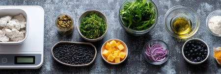 Fresh ingredients are carefully arranged for healthy pet meal prep using scales for accurate measurement, promoting nutrition and wellbeing.