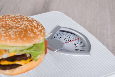 Closeup shot of burger on weighing scale