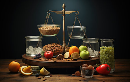 This artistic composition features a classic balance scale elegantly displaying a variety of fresh vegetables, fruits, and herbs, representing healthy lifestyle choices.