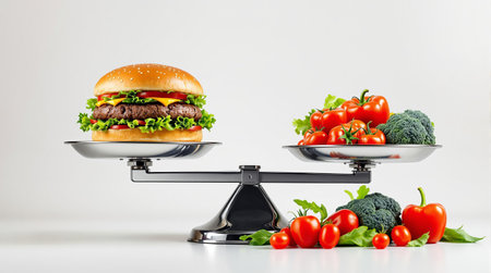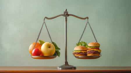 This image illustrates a balance scale comparing colorful fresh fruits with tempting fast food burgers, symbolizing the choice between health and indulgence.