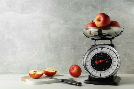 Mechanical kitchen scale with bowl of apples on wooden table against gray background