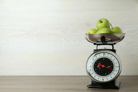 Kitchen scale with green apples on wooden table. Space for text