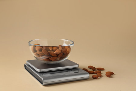 Electronic kitchen scale with almonds on beige background. Space for text