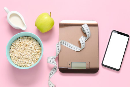 Electronic kitchen scale, measuring tape, smartphone and products on pink background, flat lay. Diet