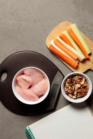 Preparation of healthy food. Pieces of meat on a table scale, nuts, vegetable sticks and a notebook for planning.
