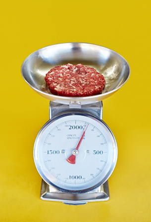 Retro scale against a yellow background with freshly minced red meat in it's bowl being weighed