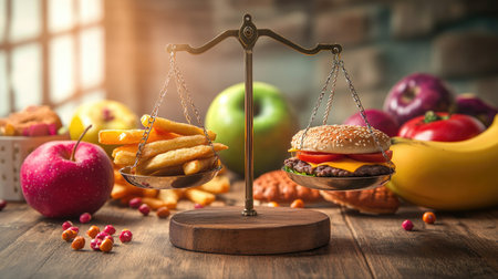 This captivating composition shows a scale weighing a delectable hamburger and crispy fries, surrounded by an array of colorful fruits and snacks, illustrating the balance of indulgence and health in food choices.