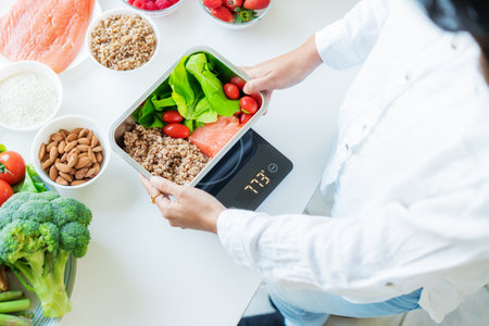 Healthy diet plan for weight loss, daily ready meal menu. Close up Woman weighing lunch box cooked in advance,ready to eat on kitchen scale. Balanced portion with healthy dish. Pre-cooking concept