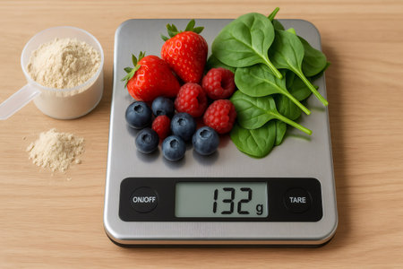 Fresh strawberries, blueberries, raspberries, and spinach leaves carefully weighed on a digital kitchen scale, emphasizing healthy eating and nutrition