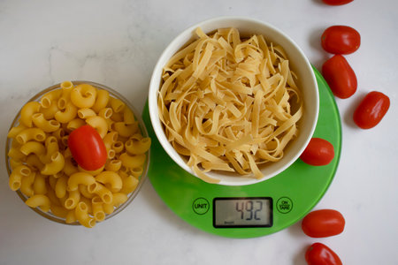 Kitchen scales, dry pasta, tomato on a light background