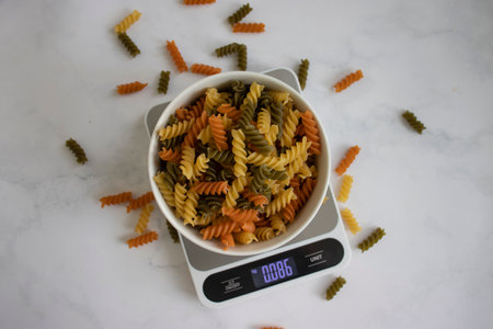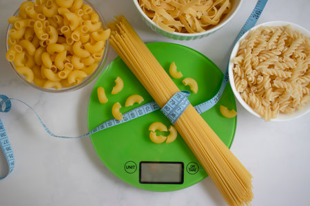 Dry pasta, kitchen scales on a light background