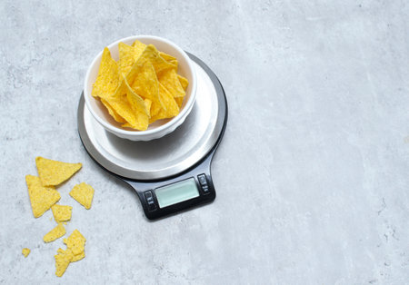 Top view of tortilla chips in a white bowl on a kitchen scale, grey marble table
