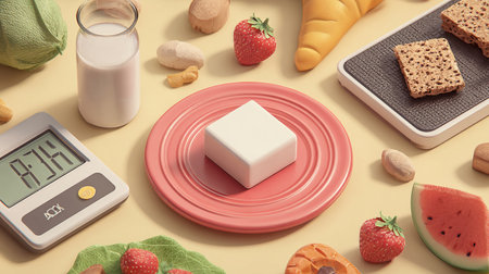 A balanced diet setup showcases an assortment of fruits, whole grains, and milk, complemented by detailed nutrition facts for awareness.