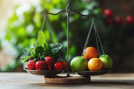 A stunning scale displays vibrant fruits on one side and colorful vegetables on the other, highlighting nature's bounty in a beautiful balance of health and flavor.