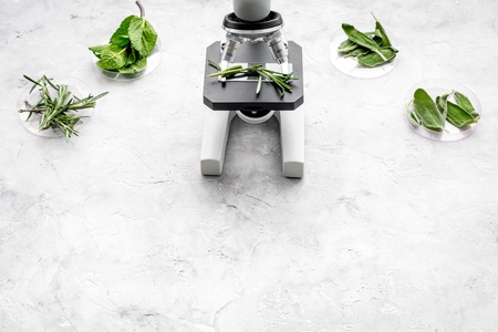 Analysing food concept. Healthy products. Herbs rosemary, mint under microscope on grey background top view space for text