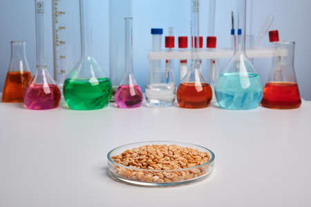 Pea groats in a Petri dish on a chemical desk - labs photo. Chemical analysis of pea seeds. Test for GMO ingredients in organic food. Safety control of nutrients. Bright colorful liquids in retorts.
