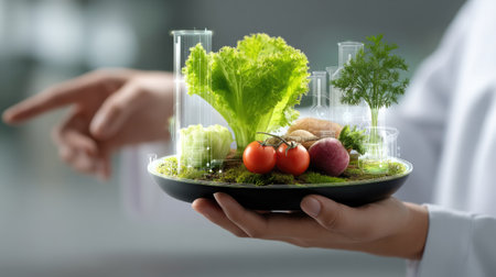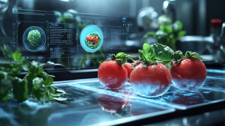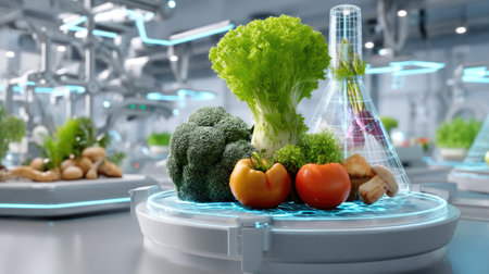 This stunning image showcases fresh produce like lettuce, broccoli, and tomatoes with a futuristic laboratory backdrop, highlighting innovative technology in food science.