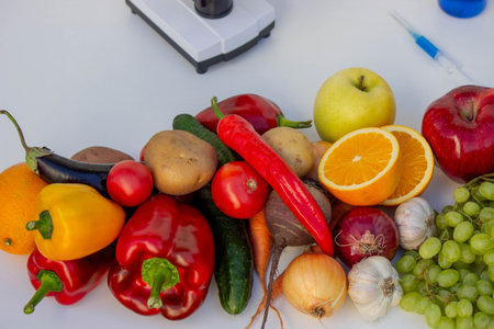 Food Quality Testing: Microscope and Fresh Fruits and Vegetables.