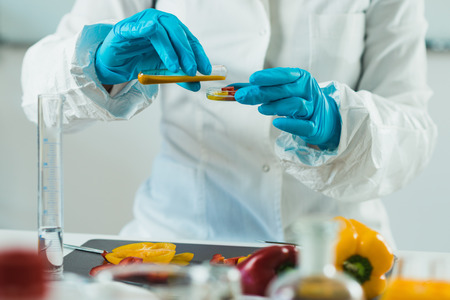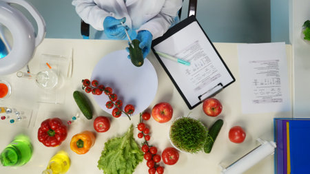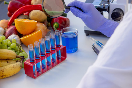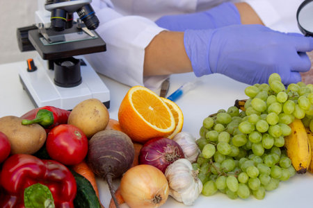 Food safety and quality analysis in a specialized microbiology laboratory, microbiologist working with fruit and vegetable samples