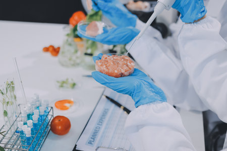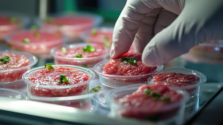 Lab-grown meat samples being examined in petri dishes, symbolizing the future of food technology and sustainable solutions