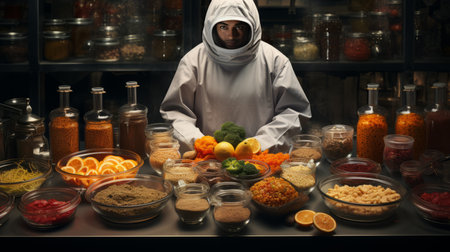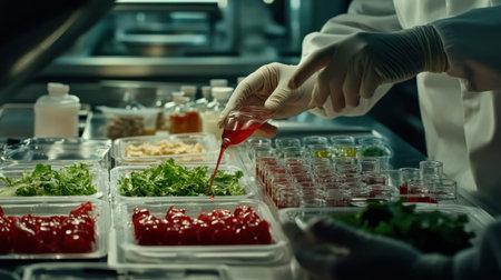 A laboratory setting shows a scientist carefully adding a colored liquid to fresh ingredients, illustrating the intersection of science and culinary innovation in modern research.