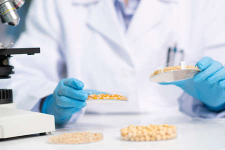 A laboratory assistant's hand holds a corn seed in tweezers, and corn seeds in a petri dish are decorated with plates with the names of E. Food Laboratory additives.