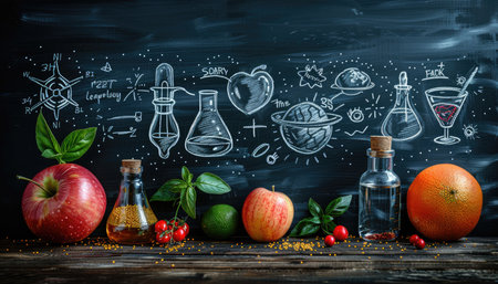 Healthy food and science formulas on chalkboard background. Healthy lifestyle concept