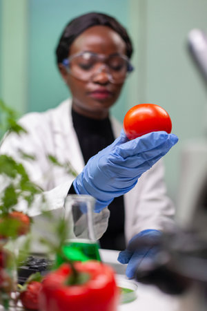 Front view of biologist reseacher woman analyzing tomato injected with chemical dna for scientific agriculture experiment. Pharmaceutical scientist working in microbiology laboratory.
