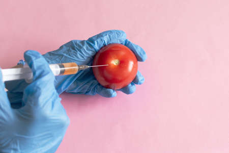 Chemical processing of vegetables, fertilizers and GMOs. Hand of person injects chemicals into tomato, GMO fertilizers and chemicals with a syringe to increase the shelf life of vegetables.
