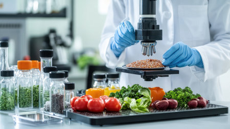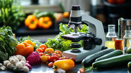 A laboratory scientist inspects fresh vegetables and seeds using a microscope, highlighting essential research in quality control and nutrition analysis for food safety.