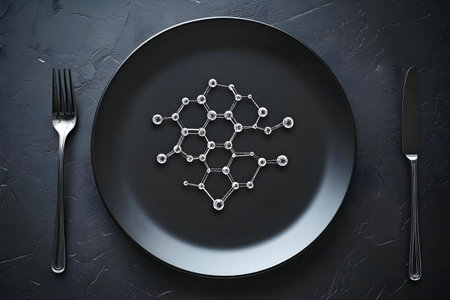 Molecular structure model arranged on a black plate with cutlery, symbolizing molecular gastronomy