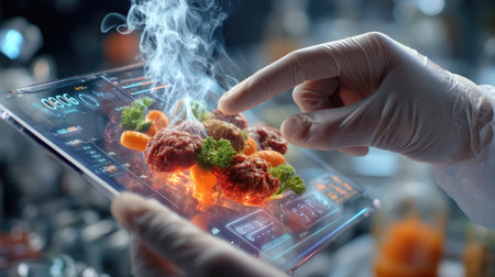 A futuristic culinary scene showcasing a hand interacting with a touchscreen displaying mouthwatering dishes and vibrant ingredients, emphasizing food technology.
