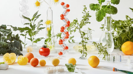 A colorful arrangement of fresh fruits and vegetables, intertwined with a DNA motif, set in a laboratory context, symbolizing the fusion of nature and science.