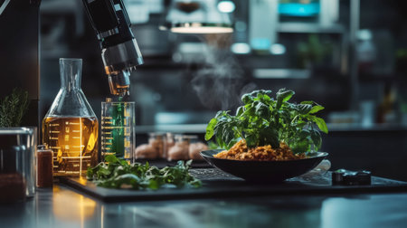 A cutting-edge kitchen scene featuring fresh herbs, cooking ingredients, and advanced tools, creating an atmosphere of culinary innovation and creativity.