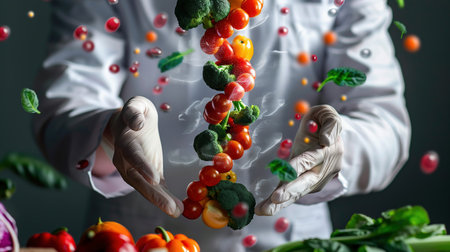 A chef in a clean kitchen, wearing gloves and a white coat, presents a plate filled with a variety of colorful vegetables, emphasizing freshness and quality.
