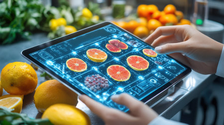A person interacts with a high-tech tablet displaying fruit options, surrounded by fresh citrus in a modern kitchen, showcasing the blend of technology and nutrition.