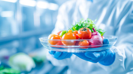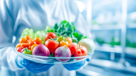A person wearing gloves presents a glass plate filled with vibrant vegetables, showing casing fresh produce in a bright kitchen environment, emphasizing food safety.