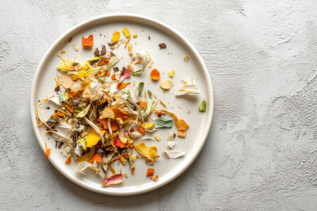 Colorful food waste scraps from vegetable preparation are artistically arranged on a minimalist plate, highlighting a sustainable approach to food.