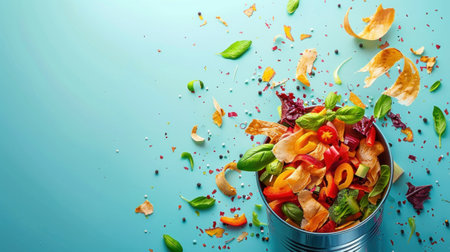 top view vegetable peels in compost bin on blue background, compost concept. Sustainable and zero waste, food leftovers
