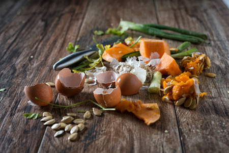 Organic peeled food, fruit and vegetables for recycling and to compost on a table. Zero waste, eco friendly, plastic free recycled, reusable, sustainable concept. Garbage sorting, kitchen leftovers
