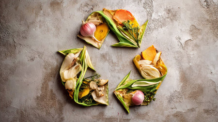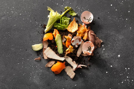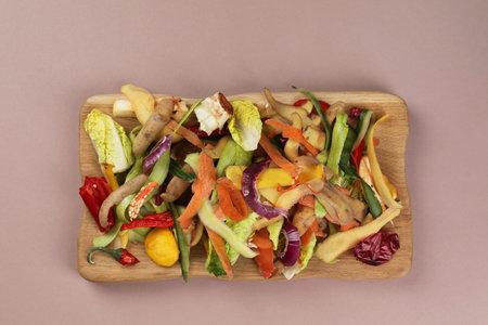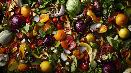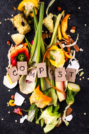 Colorful organic kitchen waste arranged on a dark surface. Fresh vegetable scraps, peels, and herbs symbolize sustainability and eco-friendly practices for composting.