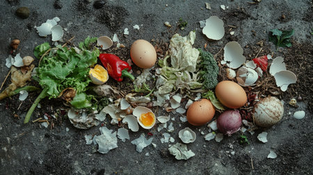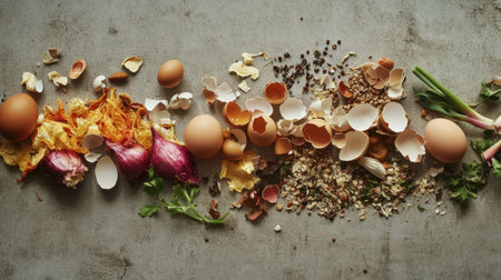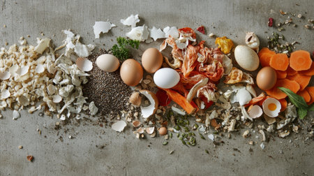 Various food scraps like eggshells, vegetable waste, and seeds piled on a gray surface, highlighting sustainable composting practices for a greener future.