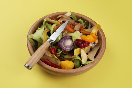 Peels of fresh vegetables and knife on yellow background