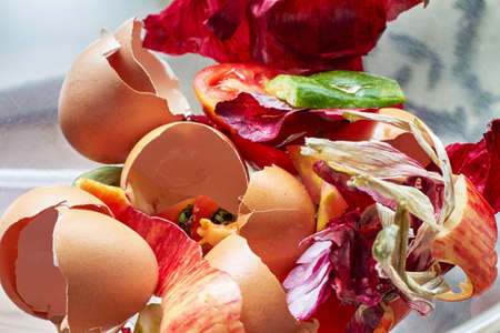 Bowl with eggshells and vegetable cuttings, organic kitchen waste is collected for compost, concept for sustainable life style, selected focus, narrow depth of field