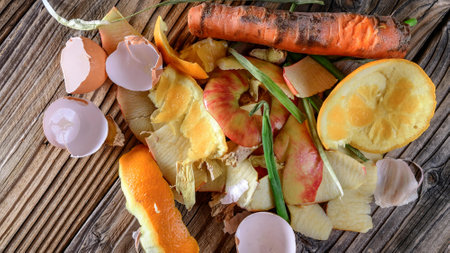A close-up of organic trash in a bin, including apple cores, potato peels, and eggshells, with a focus on the varied textures of compostable waste.