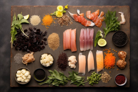 deconstructed sushi ingredients on slate board, created with generative ai