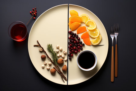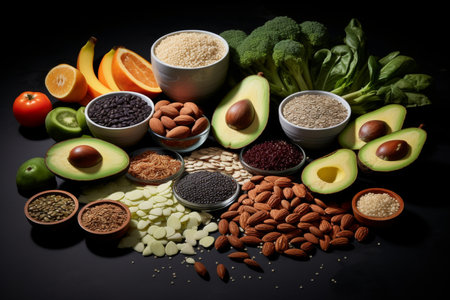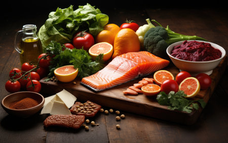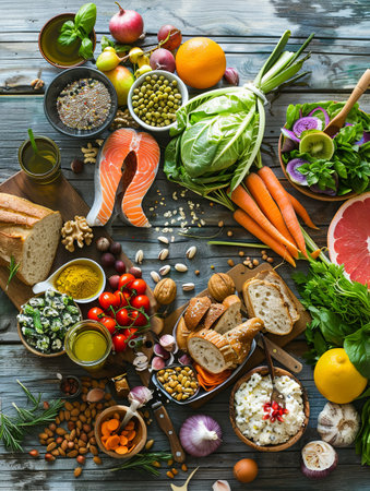 A diverse composition of nutritious food items elegantly presented in a balanced arrangement.