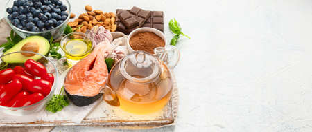 Anti Aging foods on light background. Food for healthy heart, brain and good memory. High in antioxidants, minerals and vitamins. Top view, flat lay, copy space