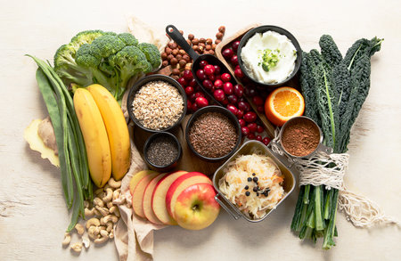 High fiber foods for healthy bowel. Healthy foods for intestine health. Diet and nutrition for constipation. Top view.