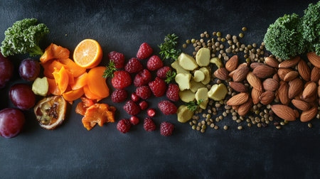 An exquisite arrangement of vibrant fruits, vegetables, and nuts on a dark marble surface, celebrating the joy of healthy eating and natural ingredients, captured from a top-down perspective with